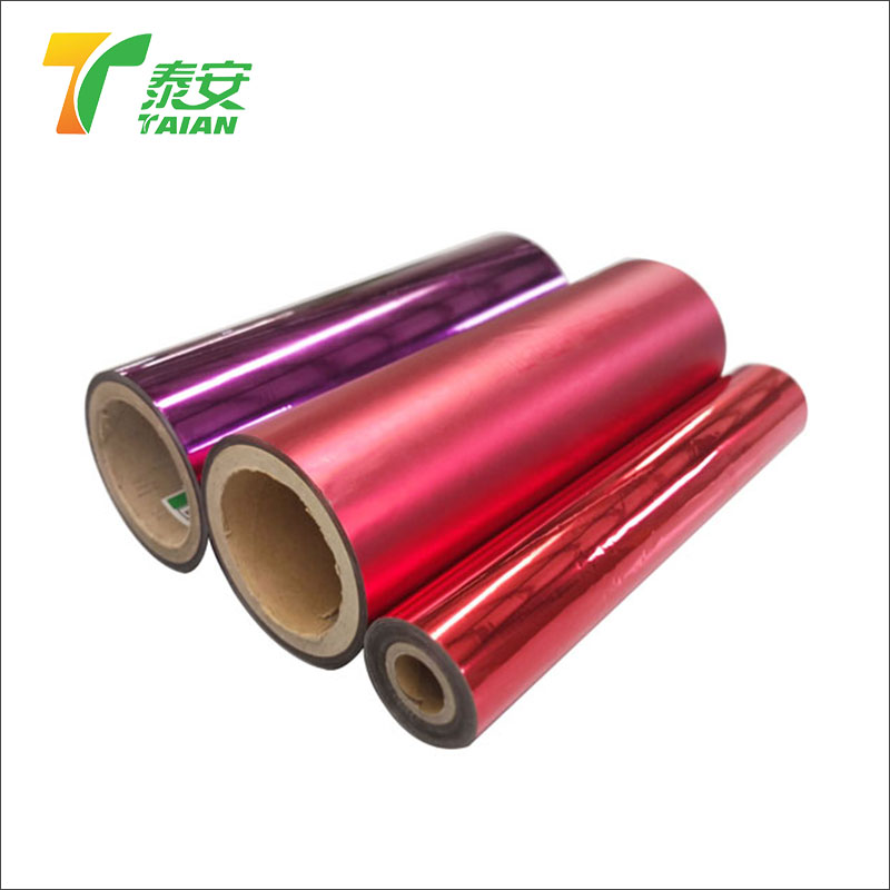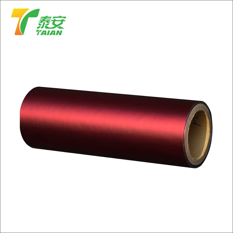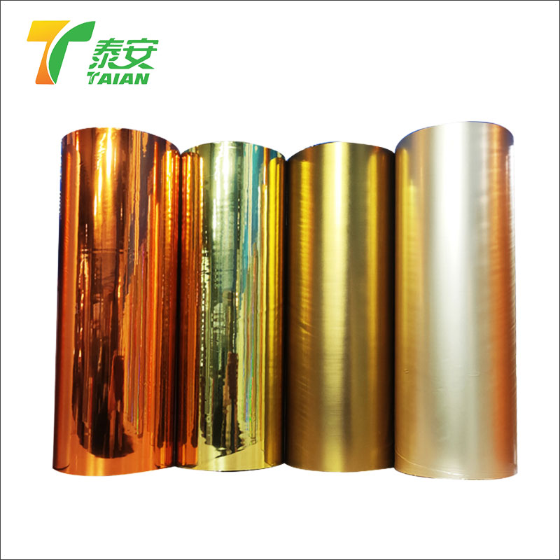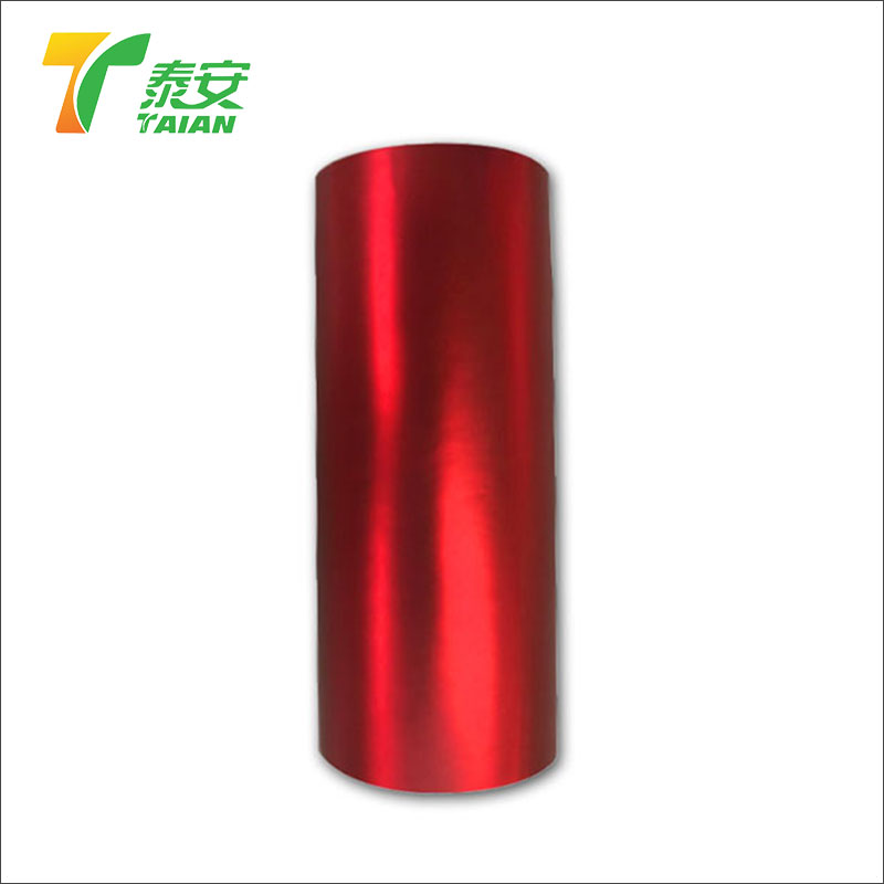 Плівка для термічного ламінування TAIAN PET матового кольору є різновидом плівок для термічного ламінування на основі ПЕТ, металізованих, оброблених з обох сторін. Завдяки різноманітним кольорам наша високоякісна плівка для термічного ламінування PET матового кольору має такий самий ефект, як і алюмінієвий папір, що, безумовно, надасть вашим пакувальним матеріалам чудової естетичної привабливості. Наш асортимент ПЕТ матової кольорової металізованої плівки для термічного ламінування доступний у 20~30 мікрон.